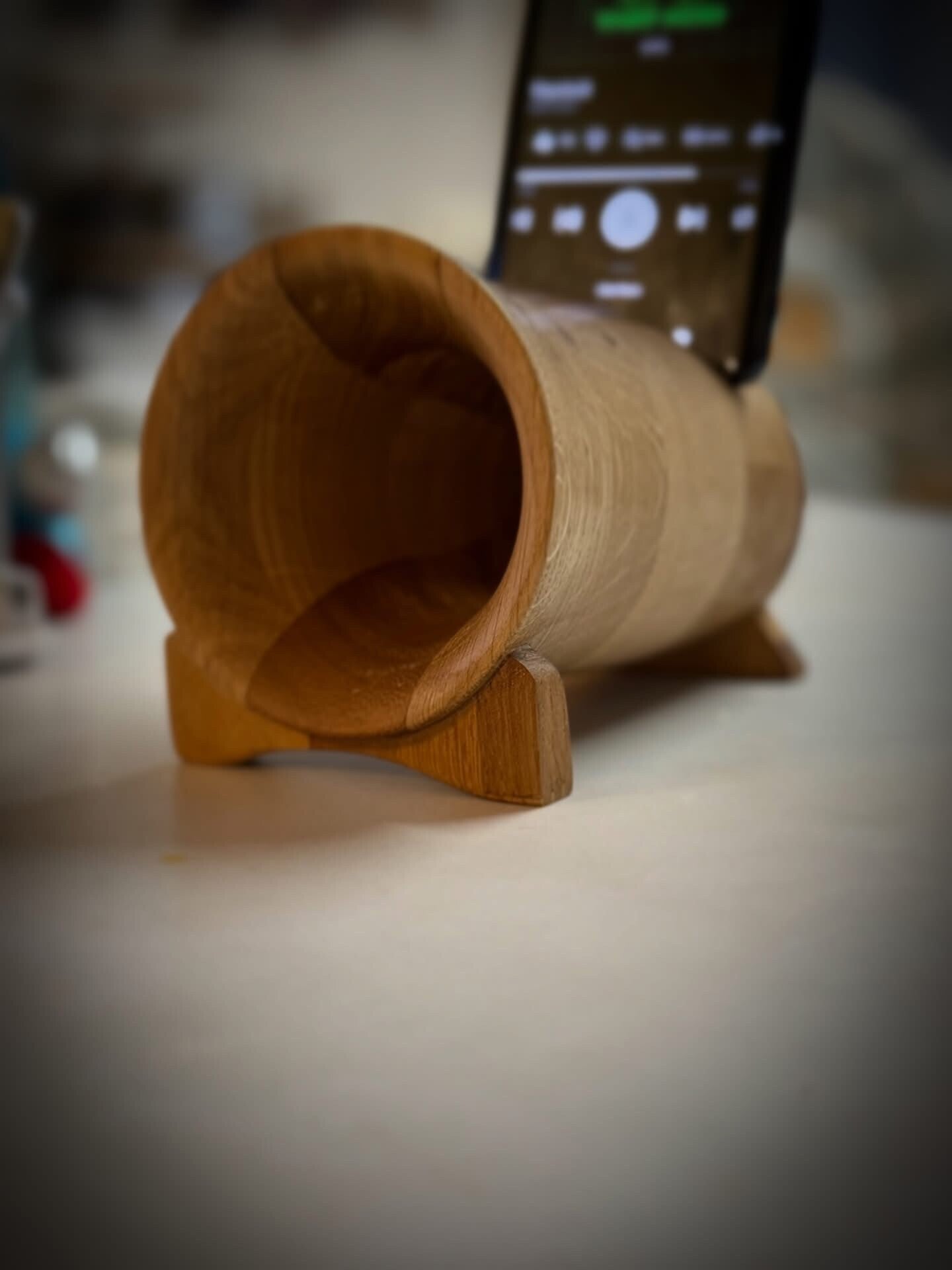 Made individually in the workshop, this handcrafted desk resonator subtly improves audio clarity from phones, tablets, or small speakers without the need for electronics. Finished by hand to preserve the natural feel of the wood, it is both functional and decorative — ideal for home offices, desks, and thoughtful gifts.